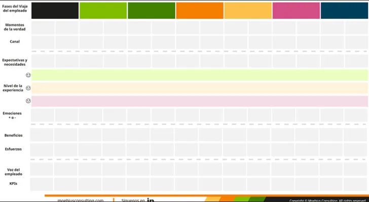 Un recurso estratégico para analizar y mejorar la experiencia del empleado. Moebius presenta una versión editable, lista para utilizar e identificar oportunidades clave en cada etapa del viaje.