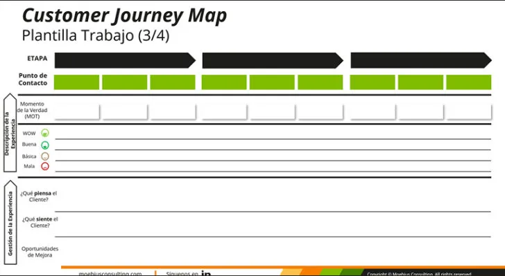 Mapa visual para facilitar procesos de análisis de las etapas, emociones y puntos de contacto del cliente con la organización. Moebius presenta una plantilla clara y práctica para diseñar experiencias de cliente más relevantes y personalizadas.