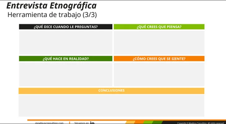 Plantilla para comprender a fondo el contexto, motivaciones y necesidades de las personas. Moebius proporciona una herramienta eficaz para aplicar esta técnica en procesos de experiencia cliente o empleado.